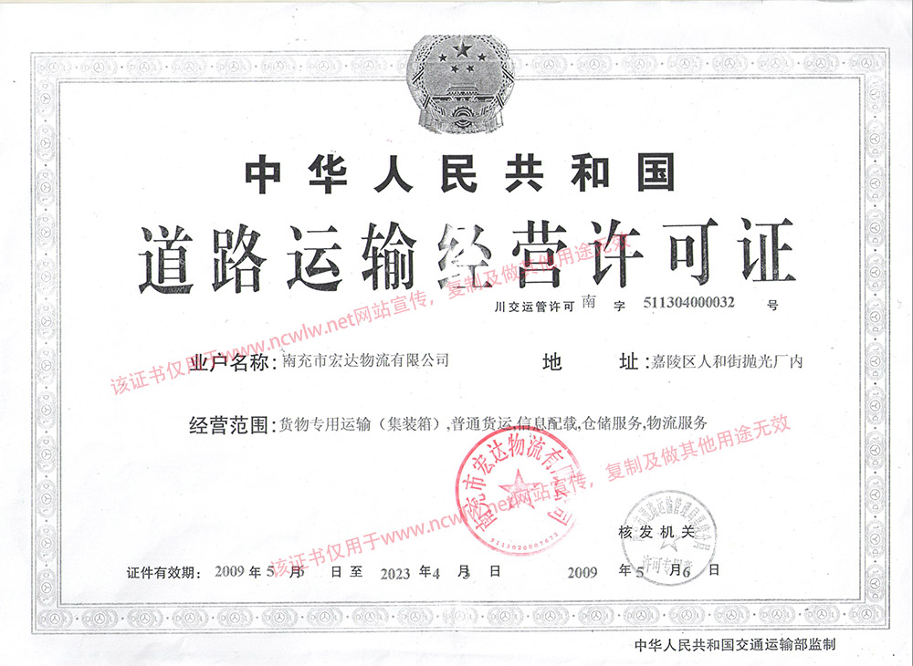 南充物流網(wǎng)(m.xyshft.com) 南充市宏達物流有限公司道路運輸經(jīng)營許可證